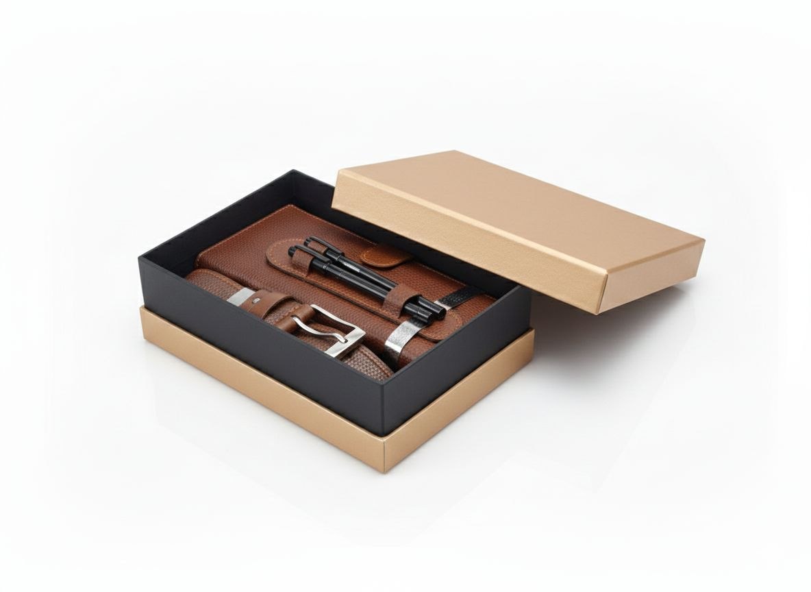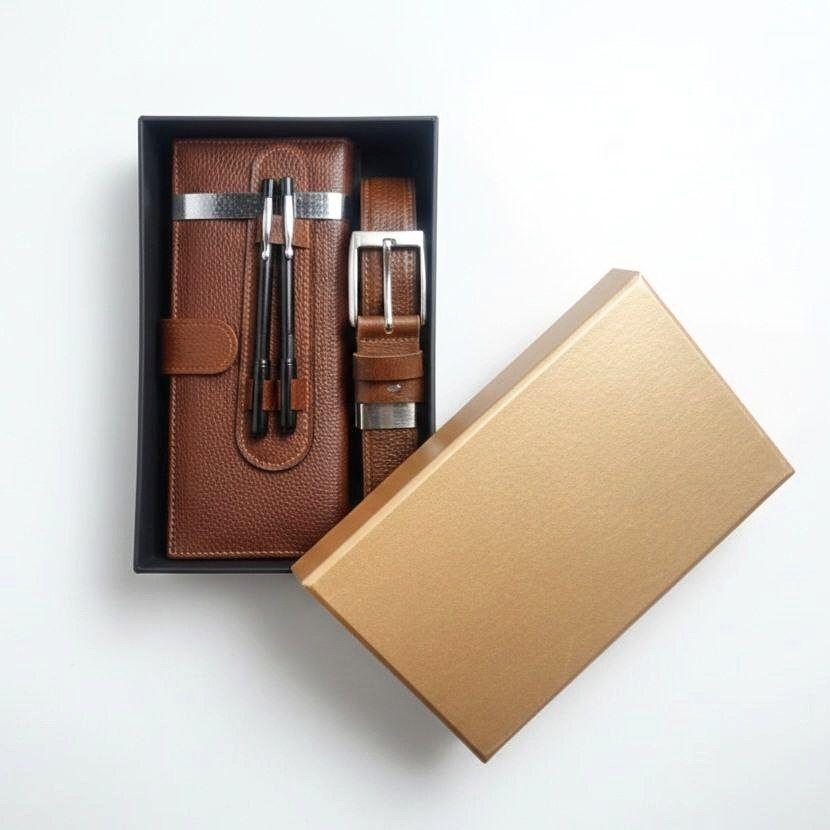 - شامل کیف مدارکی و دستهچکی، کمربند چرم طبیعی، دو عدد خودکار و جا خودکاری چرمی